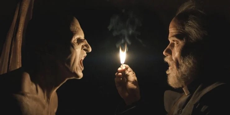 To Flanagan’s credit, despite the show ultimately becoming one of cinema’s most savage takedowns of religion’s susceptibility to erroneous interpretation, Pruitt and his flock are not dismissed as idiots, nor is religion and spirituality as a whole tossed out with the bathwater. Pruitt’s story — from the moment he meets the vampire in that cave in Jerusalem and feels, for the first time, that confusing mixture of fear and reverent awe that he will struggle with for the remainder of the show, to the moment he awakens to his mistakes and tries to set things right — is told with empathy, not mockery. A few inspired scenes of wood blocks depicting Pruitt’s meeting with the vampire and his subsequent tribulations are infused with the same contradictory blend of earnestness, tragedy, grandiosity, and humility that Pruitt himself feels. Despite knowing better, we want to believe in his conviction that all things, no matter how horrific, have a grain of goodness within them.