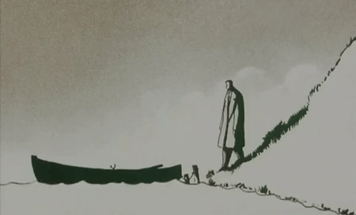 As filmgoers, we are used to seeing visual cues that let us know when something important is happening. A stagnant image, then, reflects stagnation. But while the ever-present fog around the canoe blocks out any evidence of a transition, there is a transformation happening under our noses all the while. The crew begin to regard One-Eye with distrust, suspecting that he has cursed them to be stranded for all eternity or, worse, is leading them to Hell (Hel in Norse terms), where the boy says One-Eye is from.