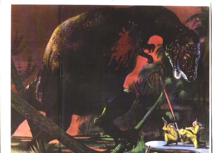 Then there is the T. Rex itself, which is depicted as a monstrous creature covered in wriggling parasites and stinking of raw meat. It’s no wonder Eckels loses his nerve, inadvertently falls off the path and crushes a butterfly, causing the mother of all domino effects that ultimately leads to the rise of anti-intellectualism and a fascist president in the future.